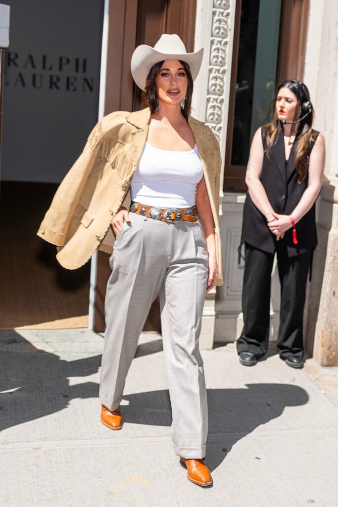 Kacey Musgraves, our prairie-pop queen, came through with Western meets urban: white tank, grey trousers, cowboy boots, and a hat that whispered, “I could rope a calf or run this boardroom.”